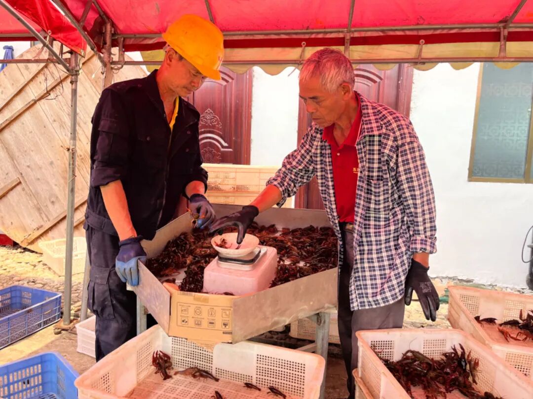 春光明媚龙虾肥。眼下正值小龙虾上市的季节,近日,位于来宾市兴宾区五山镇马则村委的广西五关生态农业有限公司富硒生态循环种养产业示范基地迎来丰收季。记者在现场看到,工人将沉浸在水中的地笼慢慢提起,拉到岸上,轻轻抖动几下,一只只生龙活虎的小龙虾便顺势滚落筐中。另一边,工人将小龙虾按照个头大小进行分拣、称重、装箱,一派繁忙的喜人场景。