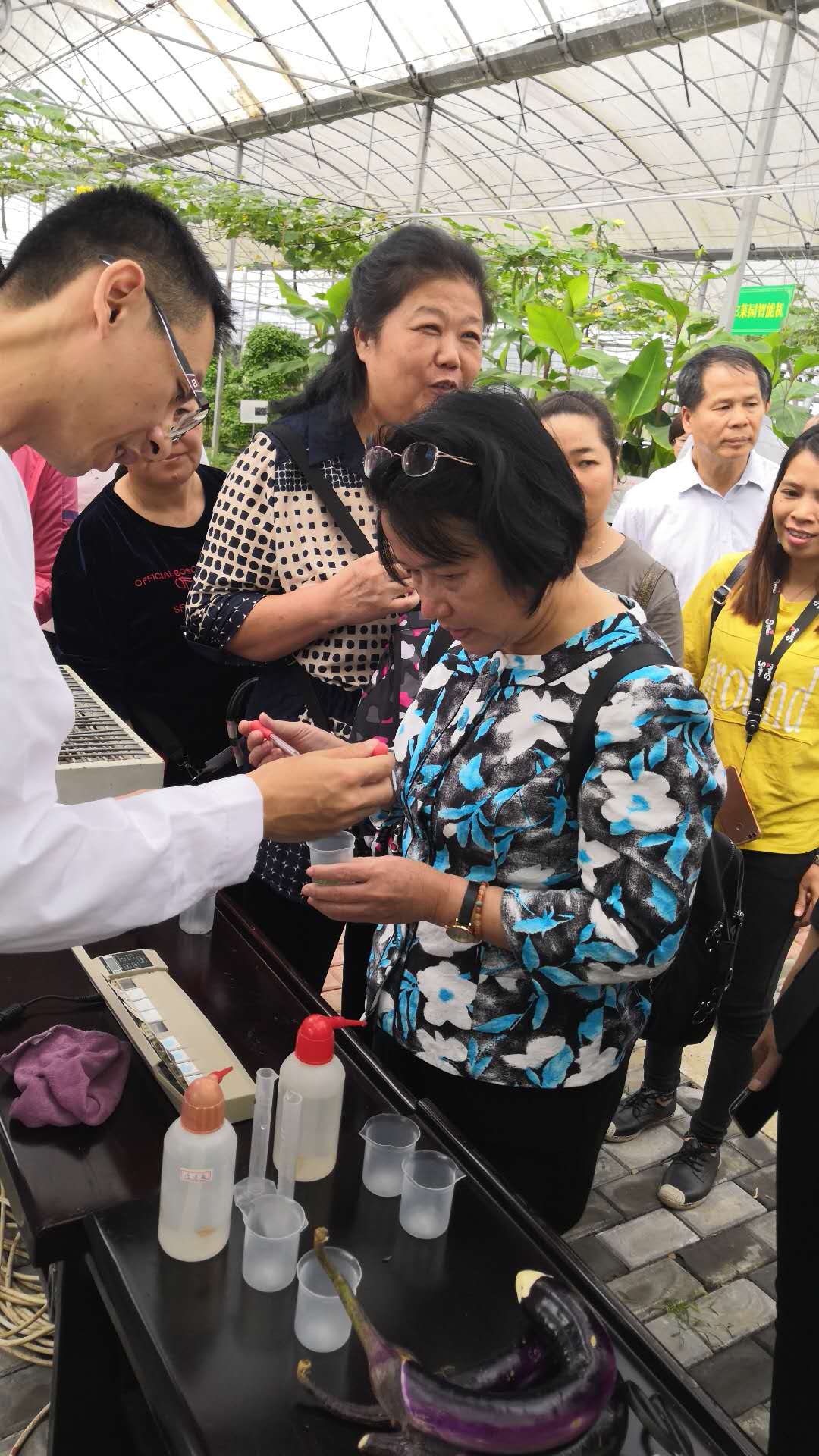在蔬菜种植基地,林亮教市民对白菜进行快速检测