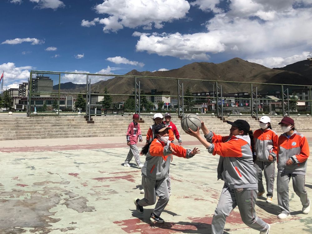 6月1日,西藏自治区拉萨市,拉萨那曲第二高级中学女学生们在操场打篮球。新华社记者齐菲摄